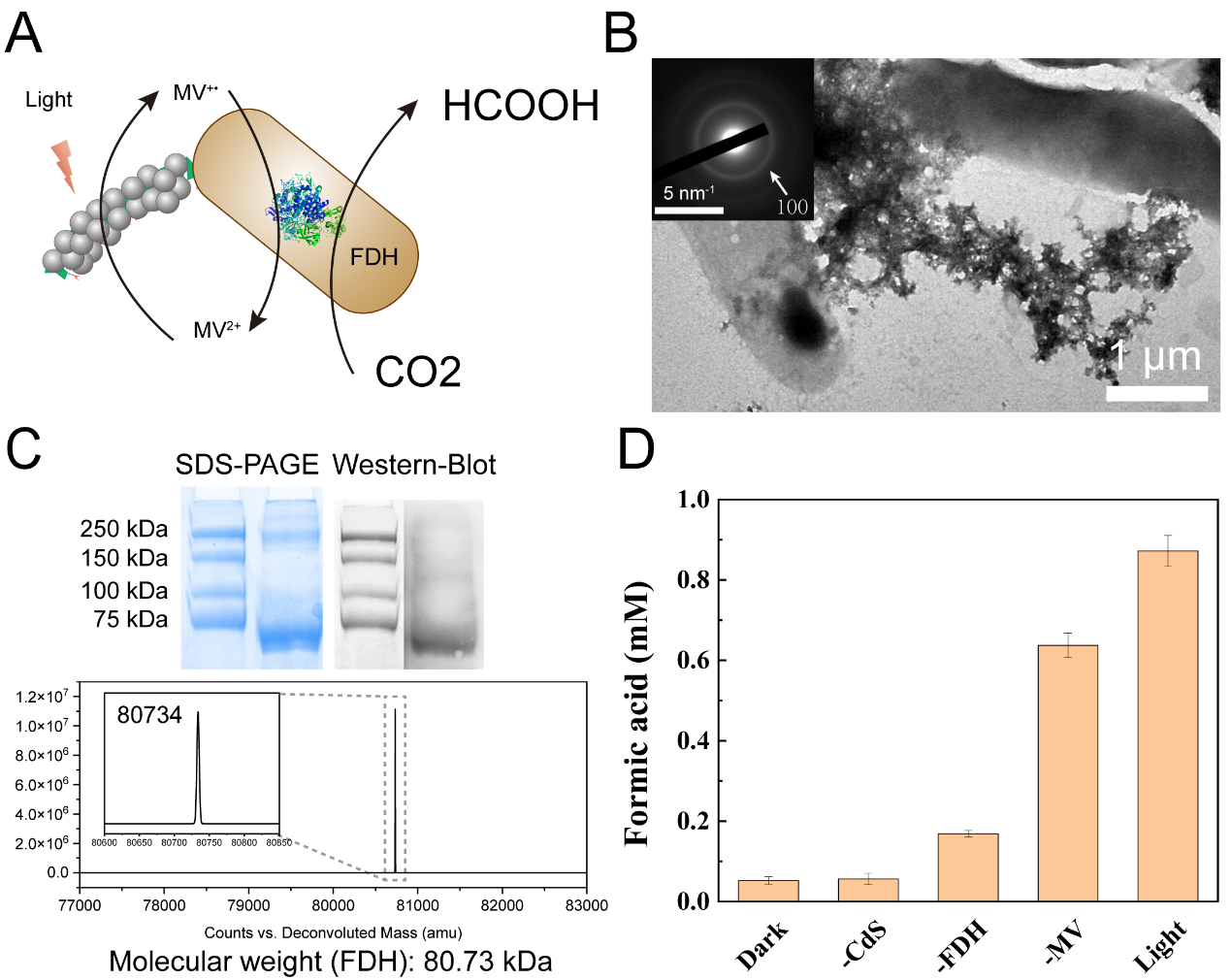 在具体的研究当中,研究人员第一时间对CsgA进行了合成生物学改造,将矿化短肽A7和CsgA蛋白融合表达并分泌,赋予生物被膜原位矿化的能力。如图1所示,顺利获得在生物被膜表面原位矿化CdS纳米颗粒,取得了光催化剂矿化的生物被膜。结合纯化的异亮氨酸脱氢酶或胞内表达的甲酸脱氢酶,可以实现从单酶到全细胞的光催化反应体系。