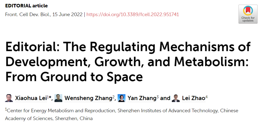 2022615日,由中国科研实验室深圳先进技术研究院能量代谢与生殖中心雷晓华副研究员联合苏州大学剑桥—苏大基因组资源中心张文胜教授、中国农业大学生物学院张焱副教授、大连海事大学环境系统生物学研究所赵磊副教授组织的专刊已圆满完成,Frontiers in Cell and Development Biology杂志在线发表了客座编辑团队撰写的题为“Editorial: The Regulating Mechanisms of Development, Growth, and Metabolism: From Ground to Space”的文章。
