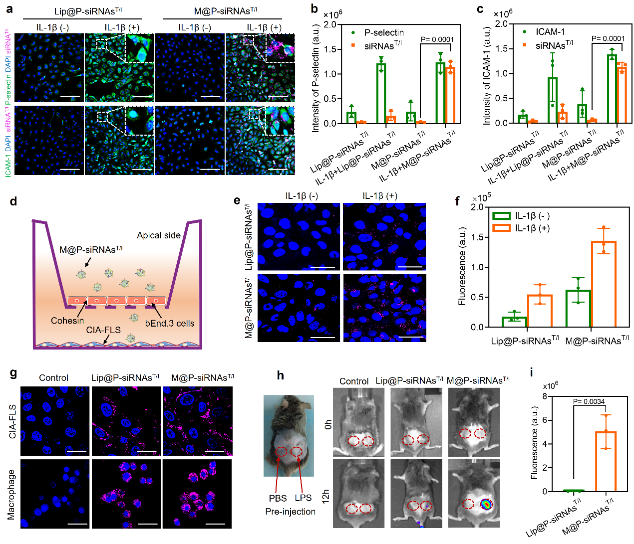 类风湿关节炎体外靶向识别机制研究。细胞膜囊泡作为药物递送系统具有天然优势,因为它们源自内源性细胞,具有良好的生物相容性以及较小的免疫原性。此外,由于炎症细胞对炎症组织固有的趋向性,因此对于药物的靶向递送具有潜在的特异识别效果。研究人员第一时间在细胞层面对M@P-siRNAsT/I的靶向性进行探索。研究发现,相比商用化脂质体作为载体的治疗体系,M@P-siRNAsT/I对血管内皮细胞、滑膜成纤维细胞具有更高的靶向识别能力。机制研究发现,M@P-siRNAsT/I主要顺利获得主动识别血管内皮细胞表面P选择素以及ICAM-1特异蛋白,进而靶向识别激活的成纤维细胞(图2)。该研究表明了仿生膜递送体系具有独特和高效的炎症细胞识别能力。
