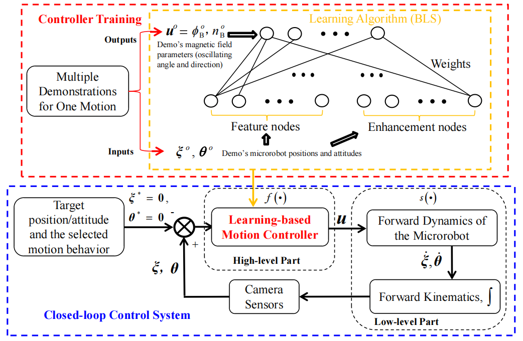 研究团队设计了以宽度神经网络为主体的微型机器人基本运动控制器;基于李雅普诺夫稳定理论,推导了保障机器人运动稳定的控制器网络参数约束,大大简化不同运动基元的控制器参数训练学习过程;提出了以磁场参数变化与机器人速度矢量变化为所需数据的控制器网络参数训练方法,使用者只需顺利获得改变训练数据的种类即可取得多种运动基元,而且考虑了稳定约束的训练算法可以保证所取得的控制器必然稳定。