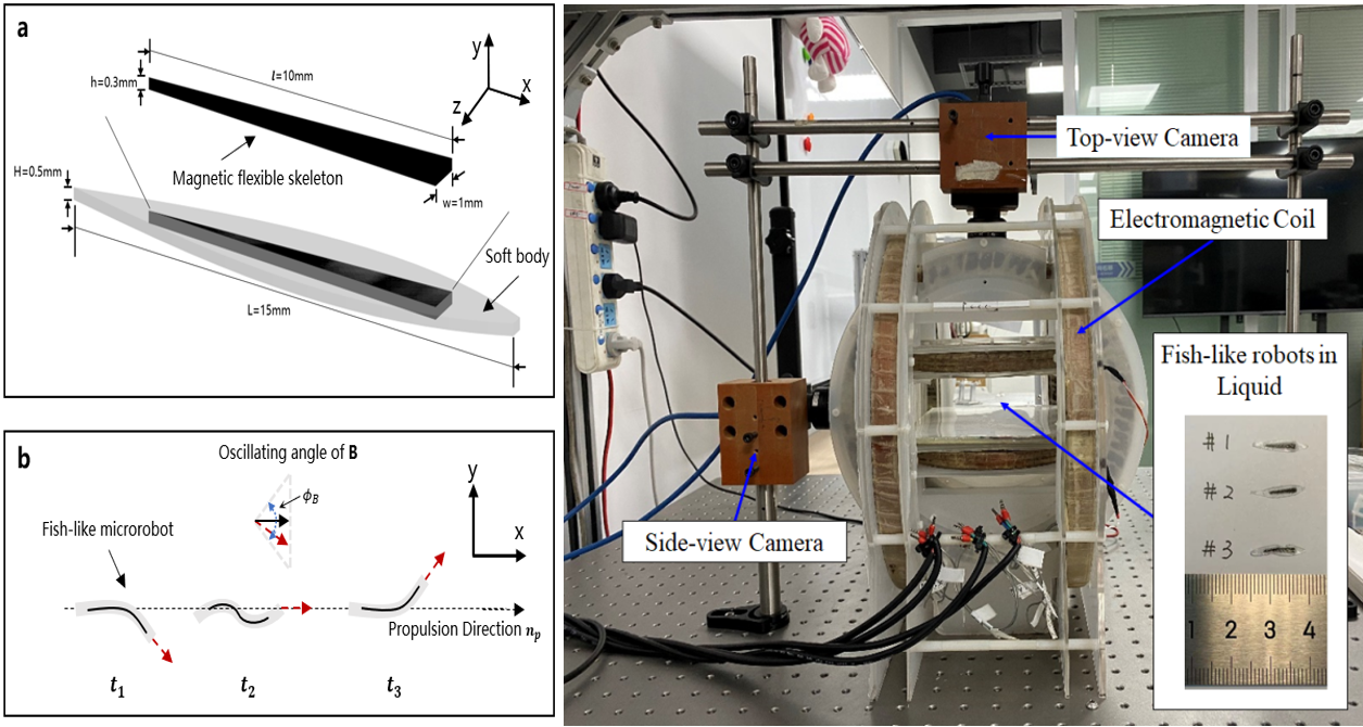 图3 微型仿鱼机器人结构及运动原理,磁驱动实验系统