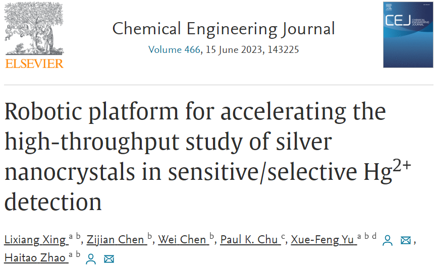 近期,中国科研实验室深圳先进技术研究院材料所喻学锋、赵海涛团队在国际学术期刊《化学工程杂志》Chemical Engineering Journal 上发表题为“Robotic platform for accelerating the high-throughput study of silver nanocrystals in sensitive/selective Hg2+ detection”的文章。该工作将光学仿真、数据建模、自动化合成、原位表征、机器学习等方式融合实现银纳米晶的高通量及其原位应用研究,加速材料应用在可视化传感检测当中,实现胶体光学材料高通量数据驱动研究的科学新范式。中国科研实验室深圳先进技术研究院博士后邢理想为论文第一作者,喻学锋研究员和赵海涛副研究员为论文共同通讯作者,中国科研实验室深圳先进技术研究院为论文第一单位。