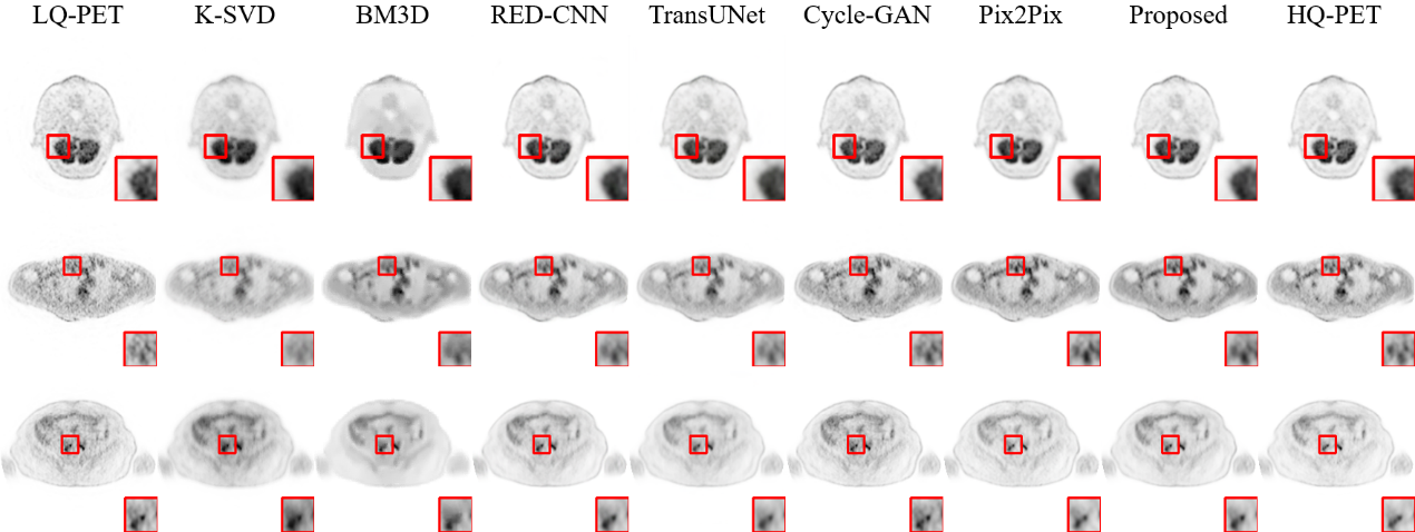 现有临床PET/CT系统由于轴向视野限制,在分辨率、扫描时间和辐射剂量等方面还有较大提升空间。最近,联影医疗推出的2米PET/CT可以同时实现人体全身PET成像、有效提高图像质量并降低辐射剂量。基于2米PET/CT获取的高质量图像,团队研发了一种短轴PET/CT系统的图像质量提升技术,可以实现短轴PET/CT重建图像的质量增强,以弥补其硬件上的轴向视野不足问题。提出模型采用Swin-Transformer和Watts-Strogatz拓扑结构双支设计,在短轴PET图像信息提取的同时兼顾空间和通道两个维度信息。实验结果表明,与现有深度学习和去噪方法相比,提出技术可以有效提高重建图像的信噪比和细节恢复能力。