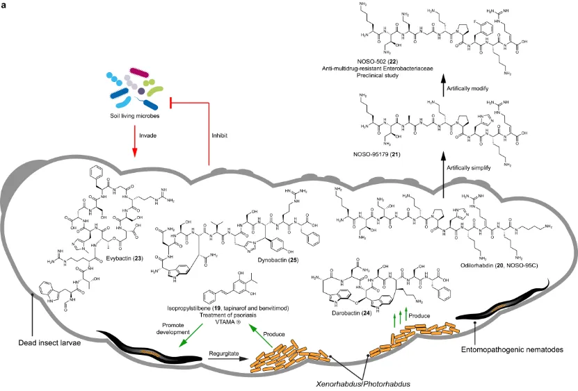 异丙基二苯乙烯是线虫发育的生长因子,可能作用于芳烃受体,调节线虫的细胞分化与活性。该化合物乳膏制剂本维莫德已经取得美国FDA批准上市,用于治疗皮炎和银屑病,是全球首创的I类新药。肽类抗生素Odilorhabdin和Darobactin作为化学防御成分,能有效抵御土壤中其他细菌入侵昆虫尸体。