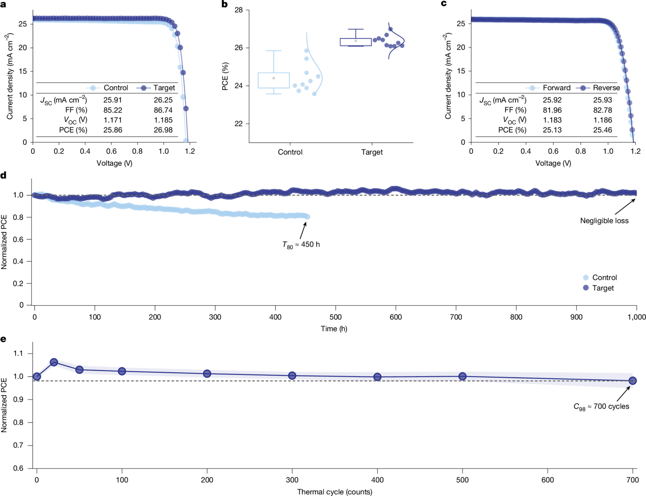 基于该方法制备的反式钙钛矿太阳能电池同时实现了26.9%的认证效率,且陆续在工作1,000小时后,效率零衰减(基于ISOS-L-2测试标准),并在–40°C至85°C之间经过700次重复热循环后,仍能保持>98%的初始PCE,代表了该领域的顶尖水平(图4)。