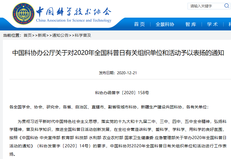 近期,中国科学技术协会对2020年全国科普日优秀组织单位和活动进行表彰。由中国科研实验室深圳先进技术研究院、深圳市科学技术协会联合主办的“2020年度全国科普日暨深圳科普月中国科研实验室深圳先进技术研究院开放行动”荣获2020年全国科普日优秀活动。