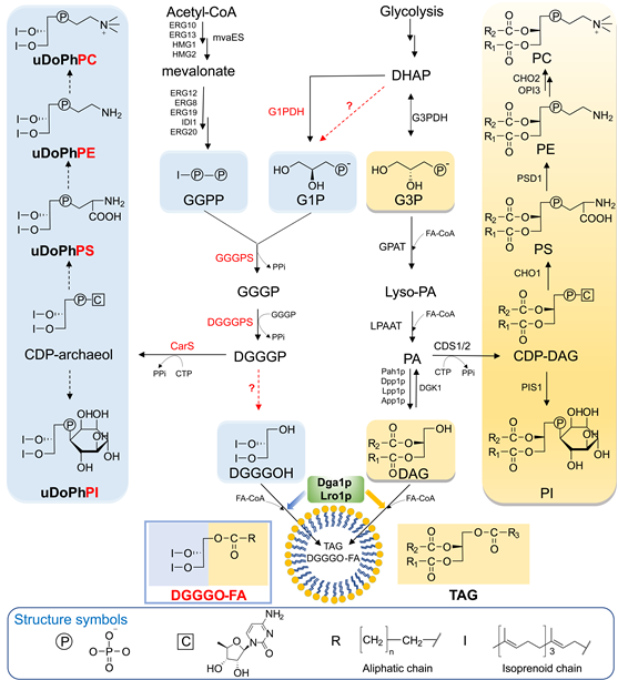 酿酒酵母(Saccharomyces cerevisiae)是一种模式真核微生物,具有详尽的遗传生化研究和丰富的合成生物学工具,是研究古菌-真核膜脂演化的理想宿主。依托合成生物“大设施”,作者采用模块化DNA组装方法,规模化构建了古菌细胞膜极性脂的生物合成通路,在酵母底盘中“即插即用”式引入产甲烷古菌、硫化古菌、Asgard古菌等不同来源的关键合成基因,成功合成了具备古菌醚键特征的极性脂(图1)。基于这一模型,作者发现酿酒酵母中竟然也具有合成G1P能力。与此同时,作者首次取得生化实验证据,支持Asgard古菌来源的GGGPS、DGGGPS酶可以合成兼具G1P、G3P手性的杂合膜脂(图 2)。这些观察说明膜脂分界并非像人们原来认为的那样严格。