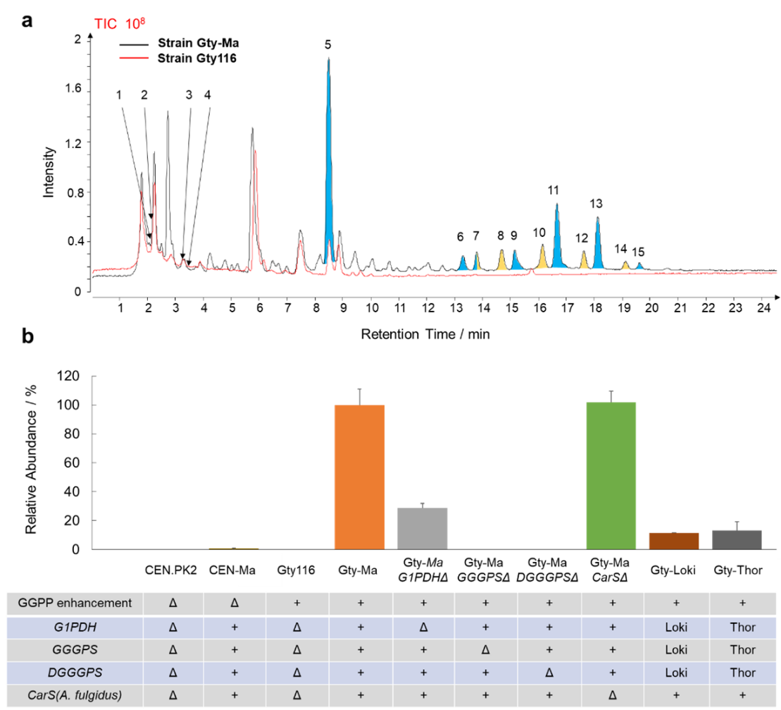 图 2 a,重组酵母Gty-Ma脂类合成,离子峰1-4:古菌极性脂;蓝色背景离子峰:5,不饱和古菌醇DGGGOH;其他,DGGGO-FAs;黄色背景离子峰:酵母内源TAG。b,古菌细胞膜极性脂类合成关键酶/通路功能表征。