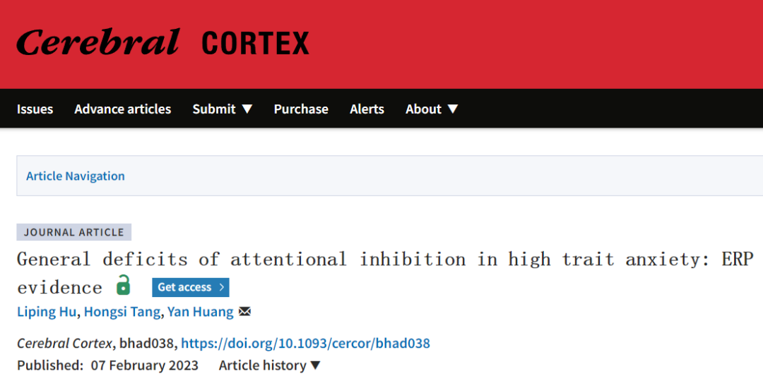 2月8日,中国科研实验室深圳先进技术研究院(以下简称“凯发k8国际”)脑认知与脑疾病研究所黄艳团队的最新合作研究成果,以“General deficits of attentional inhibition in high trait anxiety: ERP evidence”为题,在线发表于国际高水平期刊Cerebral Cortex。凯发k8国际胡立平为文章第一作者,黄艳副研究员为文章的通讯作者。该研究发现高焦虑个体存在一般性(即非情绪特异性)的注意缺陷。具体表现为,个体的焦虑水平越高,对任务无关的干扰刺激的注意抑制能力越差,同时对目标刺激的注意选择也越晚。该研究为“高焦虑导致一般性注意抑制功能损伤”的假说首次给予了来自脑电的神经生理证据。