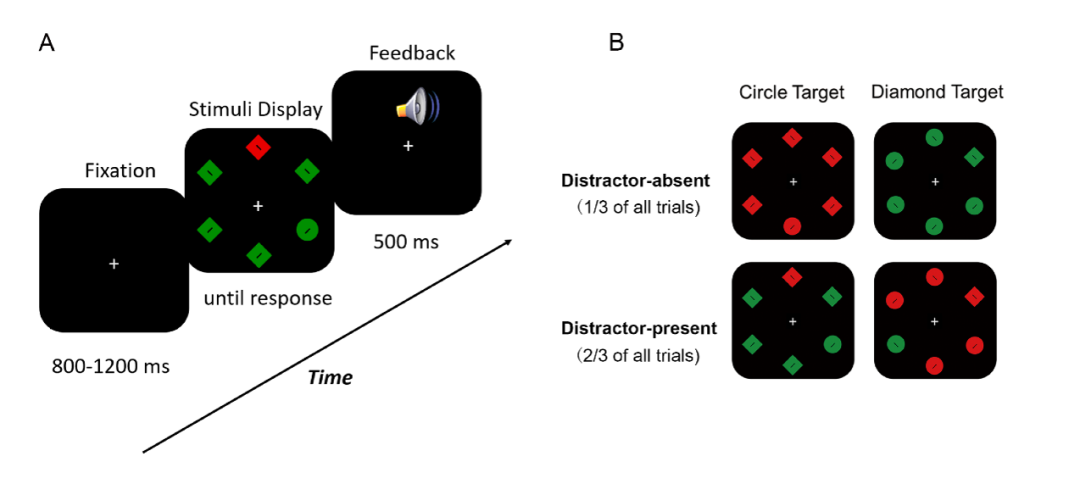 在该研究中,研究人员利用高时间分辨率脑电技术结合特定设计的视觉搜索范式,用以区分注意的不同阶段,有利于厘清焦虑相关的注意损伤机制。研究人员随机招募66名健康受试者,并顺利获得量表测量他们的特质焦虑水平(长期的焦虑倾向)和状态焦虑水平(当前的焦虑程度)。在实验中,科研人员采用了中性几何刺激的视觉搜索任务(见图1),让受试者在一圈几何图形中搜索一个形状不同的目标(例如菱形中的圆形),并尽量忽视可能出现的颜色干扰,同时用高时空分辨率的128通道的脑电设备来记录受试者的脑电信号。