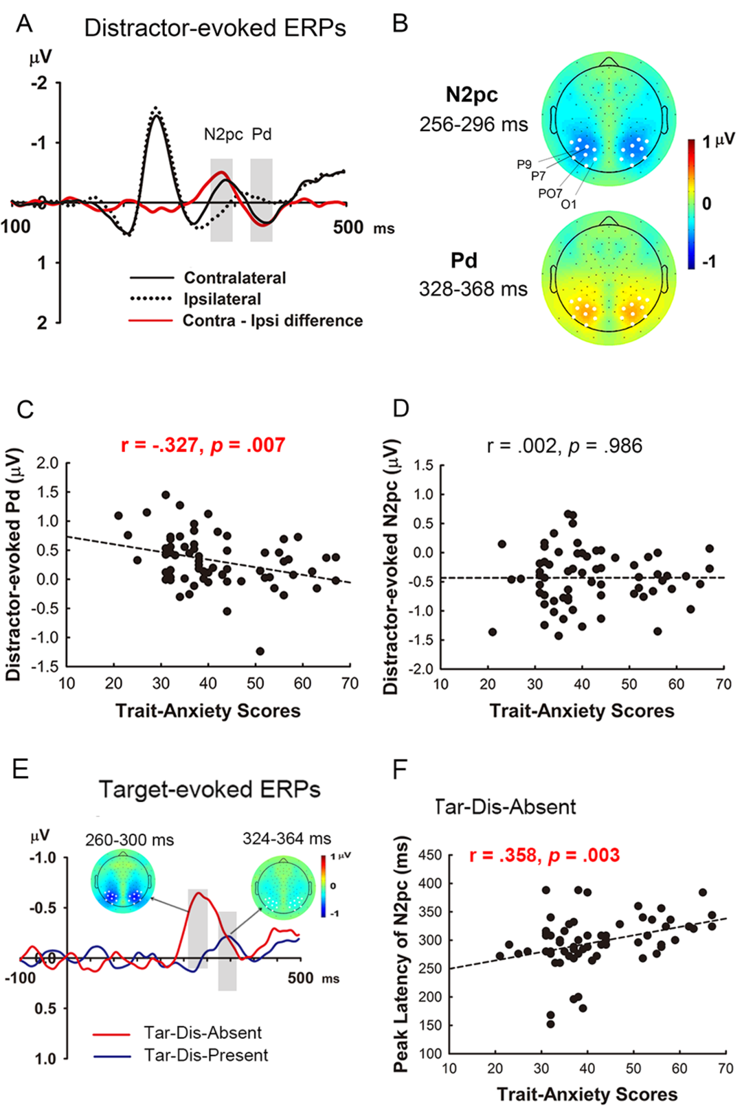 在脑电信号中,N2pc成分表征大脑的注意选择功能,Pd成分表征大脑的注意抑制功能。研究发现,在目标搜索过程中,个体先被干扰刺激捕获注意,诱发N2pc成分,然后对干扰刺激进行主动抑制,诱发Pd成分(图2 A和B)。进一步分析发现,个体的特质焦虑水平越高,注意抑制能力越差(Pd振幅减小,图2C),对目标的注意选择也越晚(N2pc潜伏期延后,图2E-F)。与特质焦虑不同,个体的当前的焦虑水平与注意功能没有显著的相关性。