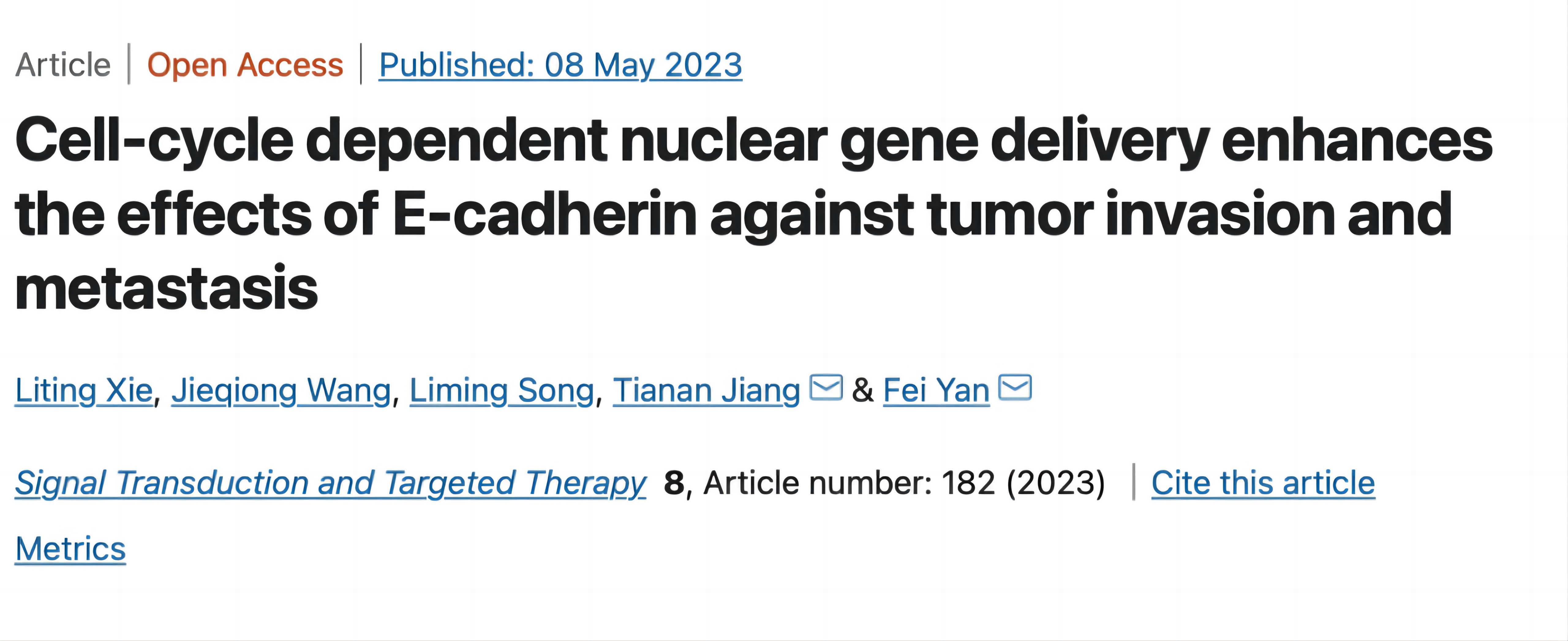 Liting Xie, Jieqiong Wang, Liming Song, Tianan Jiang and Fei Yan. Cell-cycle dependent nuclear gene delivery enhances the effects of E-cadherin against tumor invasion and metastasis. Signal Transduction and Targeted Therapy, 2023; 8(1):182. doi: 10.1038/s41392-023-01398-4.