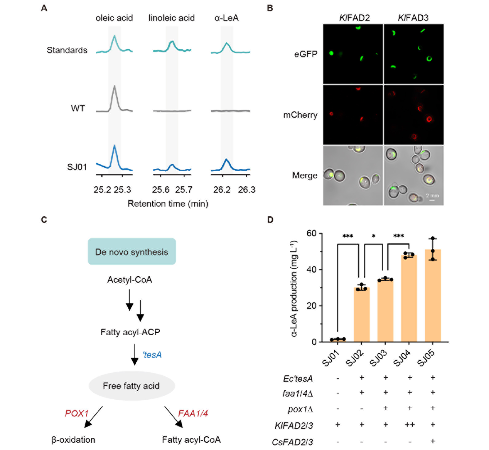 在该研究中,研究团队第一时间在酵母的内质网中合成 -LeA。 -LeA在植物的叶绿体中被合成,而酵母缺少叶绿体结构;酵母虽不能从头合成 -LeA,却可以在内质网中合成 -LeA的前体。受启发于此,该团队尝试在酵母的内质网中合成 -LeA。顺利获得在酿酒酵母中引入克鲁维酵母来源的FAD,实现 -LeA在酵母的从头合成(图2A),但 -LeA的产量仅0.7 mg/L,远不够进行下游转化。共聚焦实验表明,相关基因均成功定位在内质网(图2B)。同时,研究人员还基于改造自由脂肪酸的代谢通路(图2C),将 -LeA的产量提升至51.2 mg/L(图2D)。