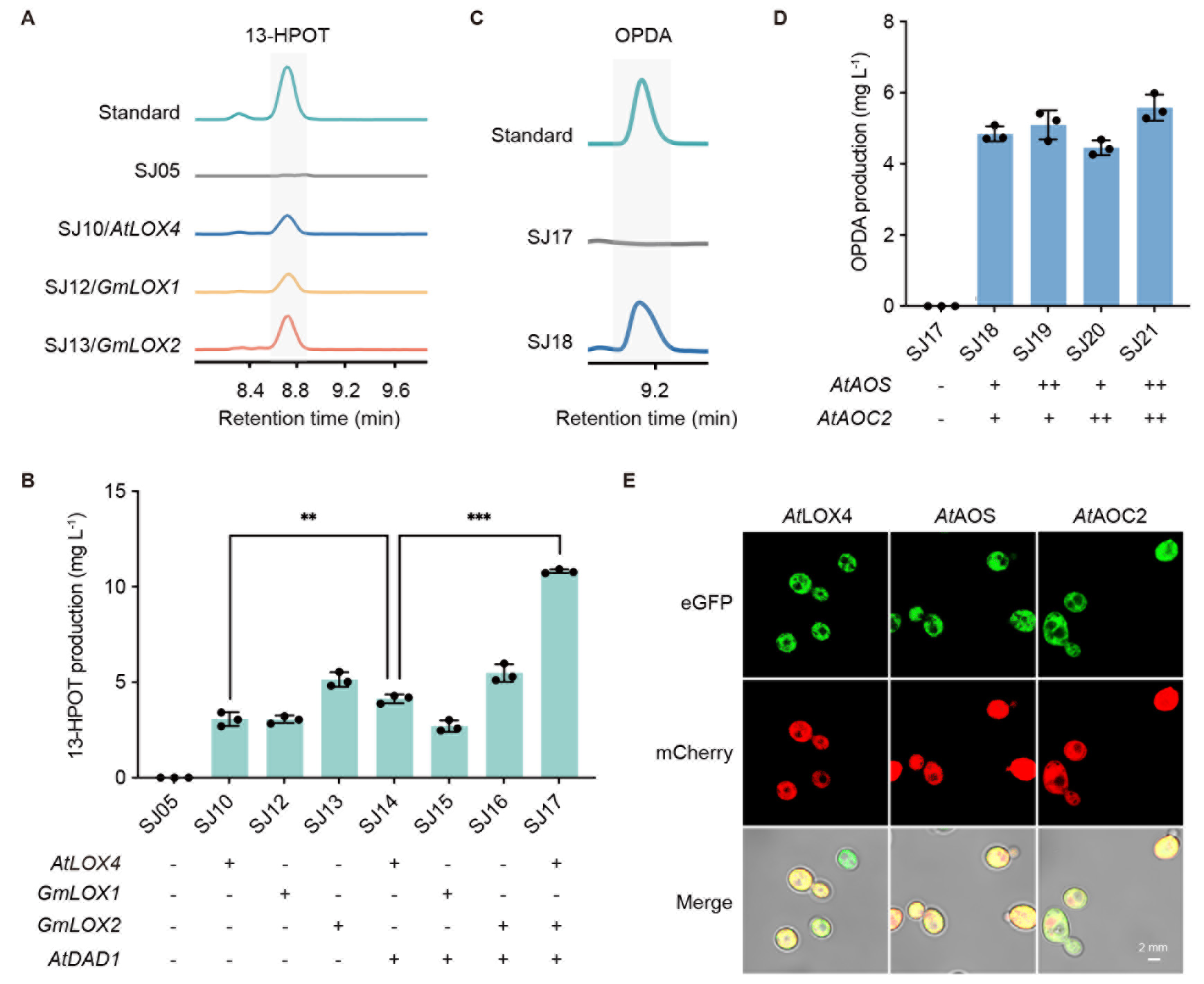 其次,在酵母的细胞质中合成OPDA。OPDA在植物的叶绿体中被合成,同样需要在酵母中寻找适合OPDA合成的场所。细胞质和过氧化物酶体是潜在的候选选项:若在细胞质中合成OPDA,后续需要OPDA转运进过氧化物酶体完成下游转化;若在过氧化物酶体中合成OPDA,则需要底物 -LeA先行转运至过氧化物酶体。考虑到 -LeA在过氧化物酶体中被降解的可能性,该团队尝试将OPDA合成途径(LOX、AOS和AOC)定位至酵母的细胞质中。第一时间对不同来源的LOX进行活性筛选(图3A)和组合表达,将中间体13-HPOT的产量提升至10.8 mg/L(图3B)。继续引入AOS和AOC,成功实现OPDA的生产,产量4.9 mg/L(图3C和3D)。共聚焦实验表明,相关基因均成功定位在酵母的细胞质(图3E)。