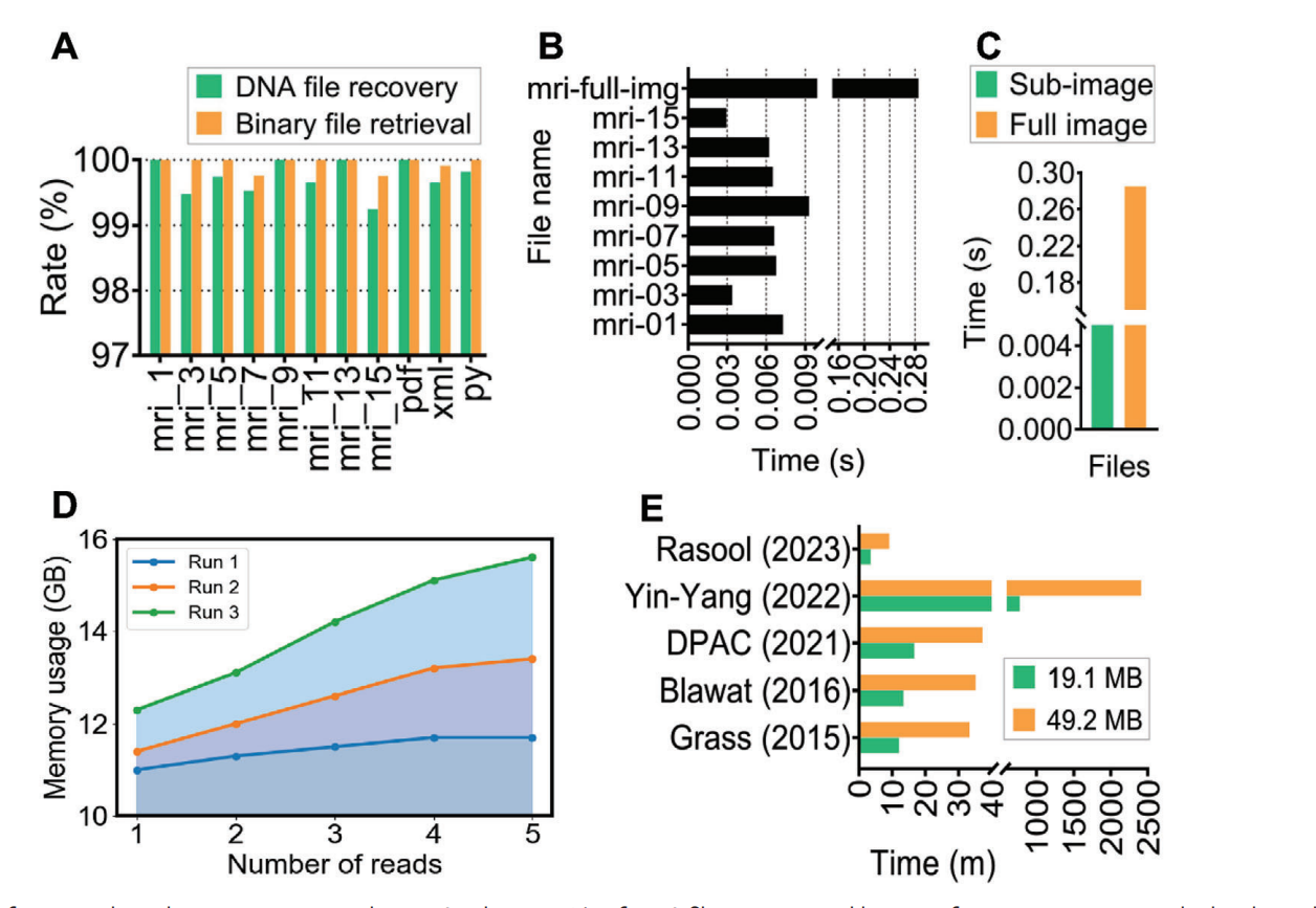 该工作在计算时间上也提出了新的方法,顺利获得利用多进程技术优化DNA存储编码流程,将编码任务分解成多个子任务,并分配多个CPU进行并行计算,提高编码速率,实验共测试了72GB的人体MRI数据,完成编码仅需9个小时,编码时间效率提升明显,同时基于数据进行了预测,1TB量级的数据在120 h能完成。顺利获得计算机模拟和生物合成实验证实,EDS方法在医学MRI数据存储方面表现出色,并且具有更好的生化约束控制和较短的计算时间。为医学MRI数据的DNA存储开辟了新的途径。