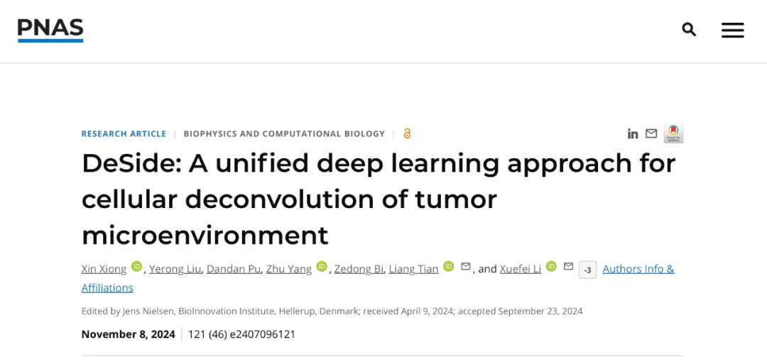 相关研究成果于11月8日以 “DeSide: A unified deep learning approach for cellular deconvolution of tumor microenvironment”为题在线发表于PNAS杂志。