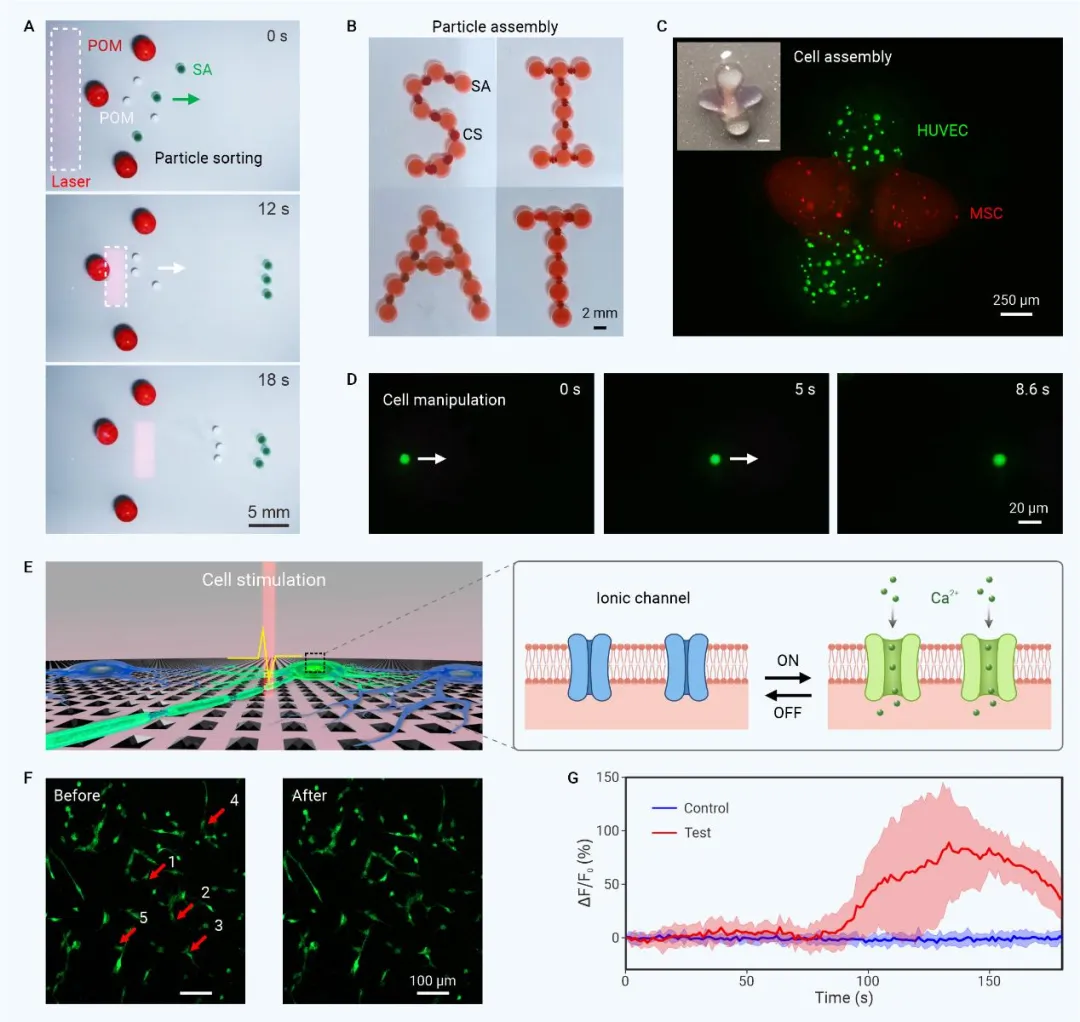 该光-电镊基于铁电高分子材料构建的光-电转换器所产生光-电场,光强比传统光镊小7个数量级,但操控作用力比传统光镊大7个数量级,这使得它能成功操作体积范围跨越10个数量级的液滴(1 pL~10 mL),并实现细胞离子通道、单个细胞到细胞聚集体的不同尺度操控(图1),为微型机器人、类器官和神经调控等重点前沿科技领域研究给予全新工具和方法。