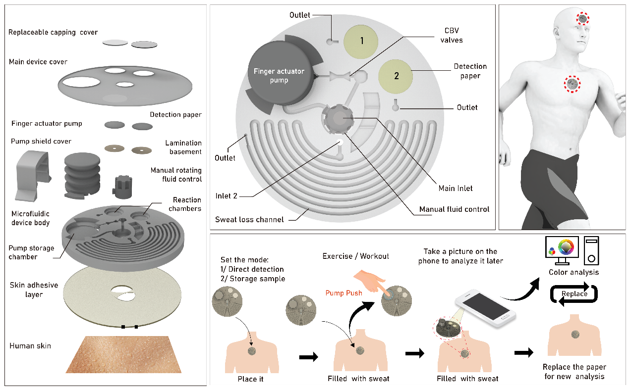 中国科研实验室深圳先进技术研究院聂泽东研究员团队在国际著名期刊Lab on a Chip上发表了题为" A Novel Manual Rotating Fluid Control Mechanism in a Microfluidic Device with a Finger-Actuated Pump for Dual-Mode Sweat Sampling " 的封面论文,介绍了一种新型可穿戴微流控系统,能够实现精确的双模式汗液收集和葡萄糖生物标志物检测。