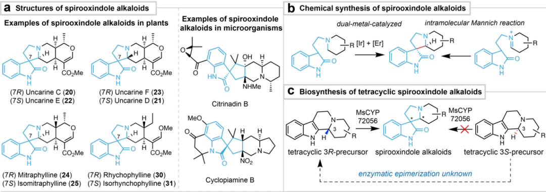 螺环氧化吲哚生物碱是一类结构复杂、生物活性多样的天然产物,具有显著的抗癌、抗高血压、抗炎等药理活性。然而,这类化合物在天然植物中含量极低,传统化学合成方法效率低下、成本高昂,难以满足药物开发和工业生产的需求。如何高效、可持续地生产这些天然产物,不断是该领域亟待解决的关键科学问题。