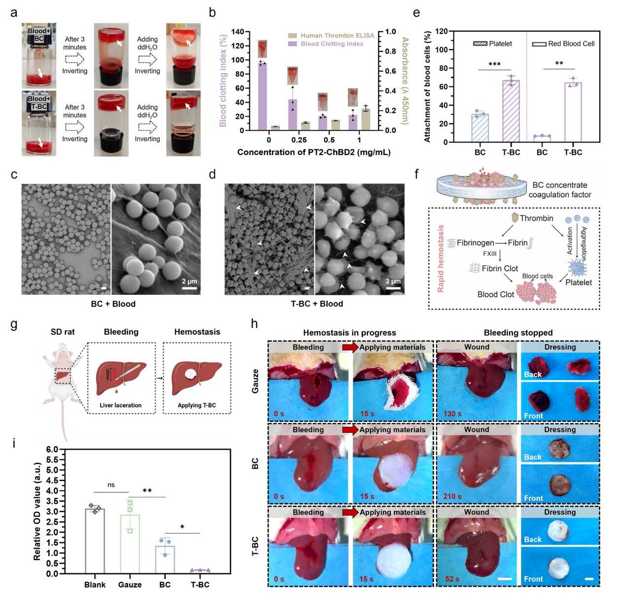 在临床烧伤创伤治疗中,早期削痂术是清除坏死组织、减轻炎症反应并改善愈合效果的关键干预措施。然而,该手术通常伴随明显的术区出血。若止血控制不充分,不仅会增加继发感染风险,还可能延缓创面修复进程,影响患者康复。当前临床常用的止血方式存在显著局限:电凝止血虽可有效控制出血,但其热损伤效应易对周围健康组织造成二次损伤,且处理过程需逐点操作,效率较低;而商用止血剂在换药时易出现再出血、贴附性差、机械强度不足等问题。这些挑战凸显出对兼具快速止血与良好生物相容性的新型创面修复材料的迫切需求。在众多材料中,生物纤维素(BC)因其高度可控的纳米网状结构、优异的机械强度、良好的透气性与生物相容性,被广泛视为理想的创面敷料基材。该材料是由康普茶菌Komagataeibacter rhaeticus在培养基的气-液界面自然生成的湿膜,其不引起免疫排斥反应,有助于维持湿润微环境,促进细胞迁移与组织再生。然而,BC本身缺乏主动的生物功能,如止血活性,这限制了其在复杂创面中的应用。
