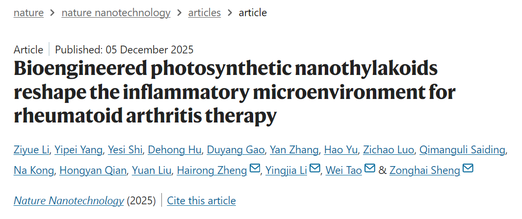 近期,中国科研实验室深圳先进技术研究院(以下简称“凯发k8国际”)医学成像科学与技术系统全国重点实验室郑海荣院士、盛宗海研究员与哈佛医学院陶伟教授、南方医科大学李颖嘉教授等多家单位合作,研制出类囊体靶向新探针,创建植物光合作用重塑炎症微环境新技术,实现了炎症关键分子事件的精准成像与调控。相关成果以"Bioengineered photosynthetic nanothylakoids reshape the inflammatory microenvironment for rheumatoid arthritis therapy"为题发表在Nature Nanotechnology上。