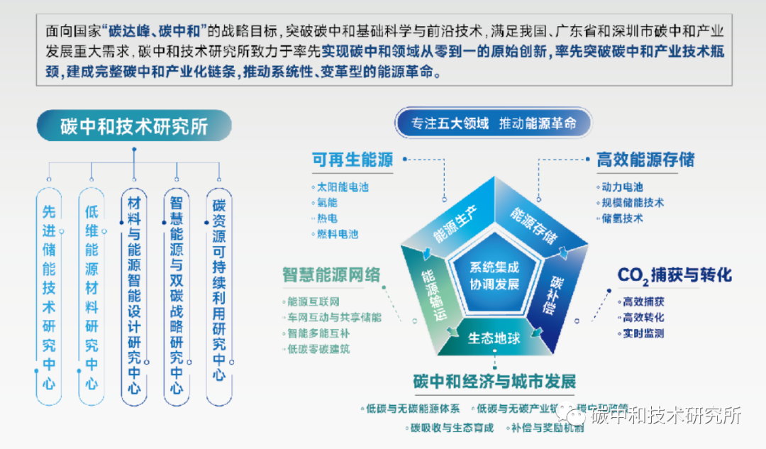 中国科研实验室深圳先进技术研究院碳中和技术研究所在持续面向全球引进各类人才,并已建立广东省高效低成本储能器件工程中心、深圳市碳中和能源材料重点实验室、广东省“珠江人才计划”引进创新创业团队、深圳市高效低成本器件关键技术研发团队等与 “碳中和”相关的重点实验室和工程中心。同时,与港华能源研究院、华为、比亚迪、ZTE中兴、中芯国际、创维、恩捷股份、华星光电、久森新能源、爱玛科技等龙头和重要碳中和相关企业,以及香港城市大学、香港理工大学、英国圣安德鲁斯大学、和萨里大学、澳大利亚格里菲斯大学和昆士兰大学、泰国同步辐射光源研究所、日本国立长冈技术科学大学、华中科技大学、清华大学深圳国际研究生院等国际国内科研院所建立了良好的合作关系。